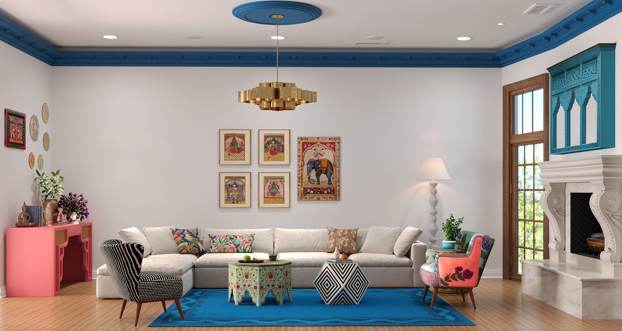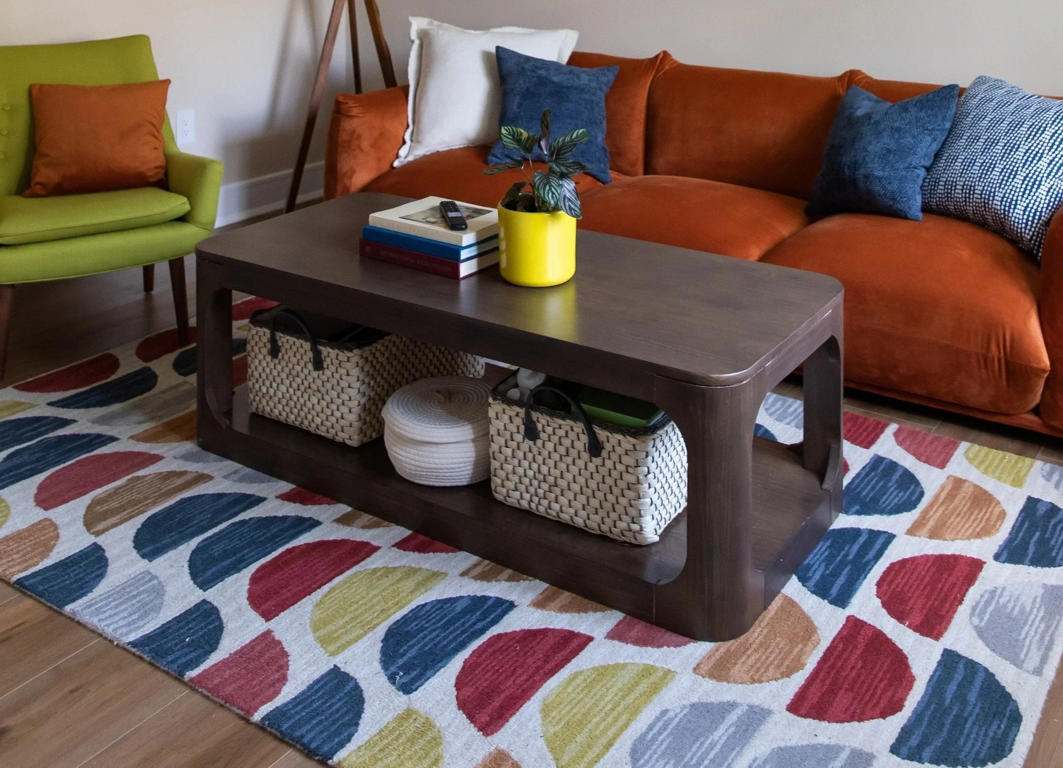 A cozy media room filled with bold color, playful pattern, and everyday comfort.