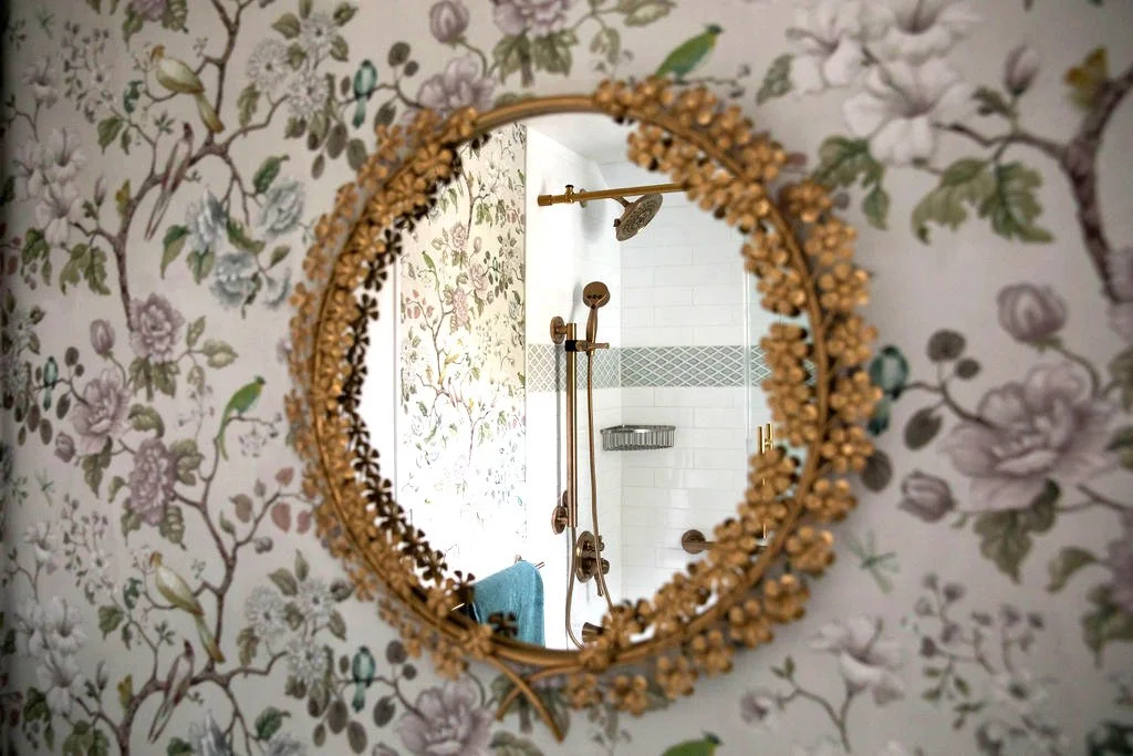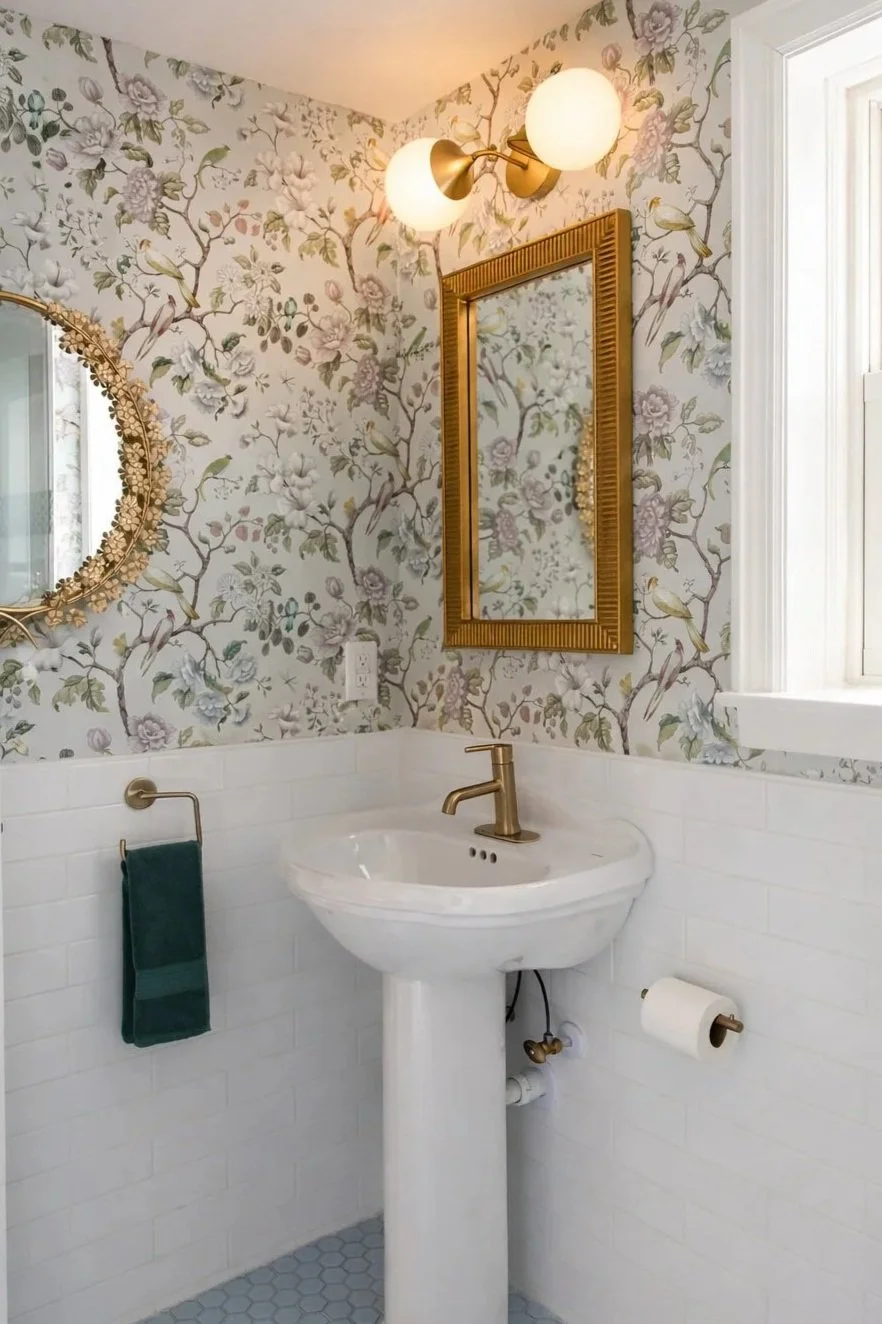 This primary bathroom was designed to feel layered, charming, and quietly elevated. Floral wallpaper introduces softness and movement, while classic tilework and warm brass fixtures ground the space with timeless structure. The mix of vintage references and clean finishes creates a bathroom that feels collected, personal, and thoughtfully updated for modern use.